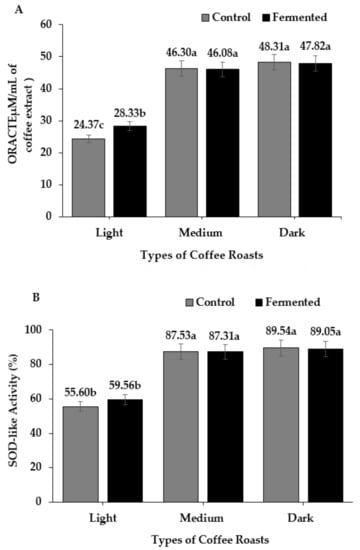 - Jung, S.; Kim, M.H.; Park, J.H.; Jeong, Y.; Ko, K.S. Cellular antioxidant and anti-inflammatory effects of coffee extracts with different roasting levels. J. Med. Food. 2017, 20, 626–635. [Google Scholar] [CrossRef] [PubMed]
