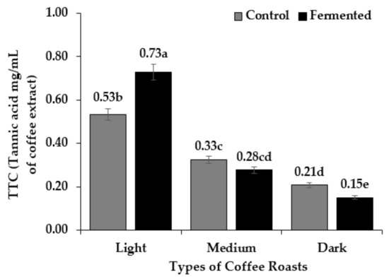- Mesfin, H.; Kang, W.H. Antioxidant Activity, Total Polyphenol, Flavonoid and Tannin Contents of Fermented Green Coffee Beans with Selected Yeasts. Fermentation 2019, 5, 29. [Google Scholar]