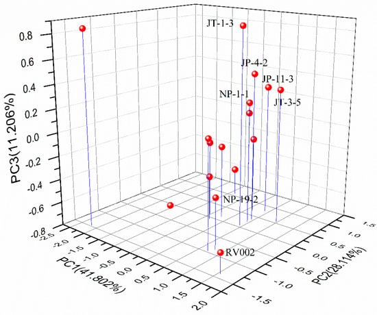 The PCA of the data derived from stress resistance properties was utilized to further reveal the diversity among these yeasts (Figure 1). PC1, PC2 and PC3 comprised 41.802%, 28.114% and 11.206%, respectively, totally enough to explain most information. Their loadings in PCA were shown in Figure S1. As shown in Figure S1, the all-resistance parameters were in the forward direction in PC1 loading. As for PC2 and PC3, citric acid and SO2 resistance contributed mostly to the forward direction, but ethanol resistance was both in the negative direction. JT-1-3, JP-4-2, JP-11-3, NP-1-1, JT-3-5 were all positioned in the forward direction of PC1, PC2 and PC3, showing the high resistance to these stress conditions, especially high citric acid and SO2 resistance, combined with relatively low ethanol resistance (Figure 1). Among that, JT-1-3 stands out especially, owing to its highest SO2 resistance properties. NP-19-2 and RV002 were in the lower quadrant for the strong ability to bear high alcohol (Figure 1). Furthermore, the screened non-Saccharomyces cerevisiaes and commercial S. cerevisiae RV002 were easily distinguished in Figure 1. JT-1-3 showed the greatest potential to survive under these stress environments, or even more hostile ones than other non-Saccharomyces cerevisiaes, and it was selected as the optimal yeast strain for further research.