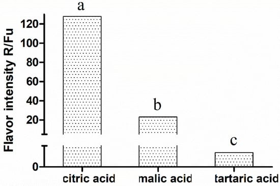 The flavor intensity of three kinds of organic acids (citric, malic and tartaric acids) in kiwifruit wine. Different lowercase letters (a,b,c) illustrate the significant differences (p < 0.05).