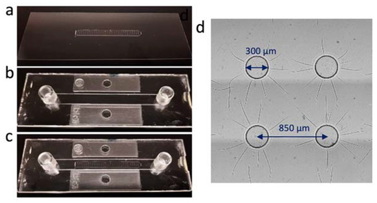 The microfluidic chip (Figure 1c) was made of two parts: the microwell array on a glass slide (Figure 1a) and the top plate with a microfluidic channel (Figure 1b). The microwell array was produced in the epoxy-based photoresist SU-8 through a standard photolithography protocol. The mask design of the microwell array consisted of three rows of 34 wells with a well diameter of 300 µm and a pitch distance of 850 µm (Figure S1). Visual inspection of the microwells after photolithography showed that the SU-8 wells matched the mask’s dimensions (Figure 1d). Furthermore, the measured well’s depth was approximatively 50 µm (Figure S1b), which fits the expected thickness of the SU-8 layer, according to the protocol mentioned earlier. Altogether, these results prove the photolithography process to be successful and a quick method to produce the microwells in the microfluidic chip.