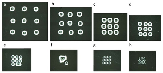 Optimization of the printing on a glass substrate. Water droplets were piezo dispensed (pulse duration of 15 µs and voltage of 75 V) as a 3 × 3 array on a glass coverslip: (a) 100 droplets at a frequency of 50 Hz with a pitch of 1000 µm; (b) 100 droplets at a frequency of 50 Hz with a pitch of 750 µm; (c) 100 droplets at a frequency of 50 Hz with a pitch of 500 µm; (d) 50 droplets at a frequency of 25 Hz with a pitch of 400 µm; (e) 25 droplets at a frequency of 25 Hz with a pitch of 300 µm; (f) 25 droplets at a frequency of 25 Hz with a pitch of 250 µm; (g) 10 droplets at a frequency of 5 Hz with a pitch of 250 µm; (h) five droplets at a frequency of 4 Hz with a pitch of 200 µm.