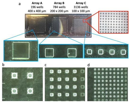 Secondly, we evaluated the filling of microwells with water droplets using piezo dispensing. Therefore, we initially used a commercially available microtiter plate (size of a microscope slide) that contains squared microwells with dimensions of 400 × 400 µm (array A), 200 × 200 µm (array B), 100 × 100 µm (array C), and height of 20 µm (Figure 3). The pulse duration (15 µs) and amplitude voltage (75 V) were as for printing on the glass substrate. With a frequency of 50 Hz, the number of droplets decreased from 200 drops per well for array A to 25 drops per well for array B and five drops per well for array C.