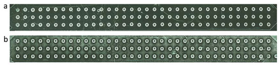Con A and yeast cells dispensing into the microwells of the microfluidic ship (pulse duration of 15 µs, voltage of 75 V and frequency of 50 Hz): (a) 60 droplets of Con A were printed, (b) 40 droplets were printed from the yeast solution (OD600 of 0.5).