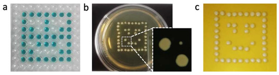 Evaluation of the washing protocol to avoid cross-contamination. (a) Printing pattern to evaluate the washing protocol of the piezo dispenser. Transparent wells contain a yeast solution in PBS, and the colored wells contain a blue dye (no cells). (b) Washing protocol based on pressure resulted in 1 cross-contamination colony. (c) Washing protocol based on the syringe pump resulted in spotting without cross-contamination.