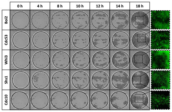 A selection of 34 GFP-tagged S. cerevisiae clones that are related to the cell cycle were printed as triplicates into the well array (Figure 4, S2e), and the chip was closed by sticking the microfluidic channel to the microwell substrate (Figure 1). Time-lapse microscopy was used to follow the growth during 18 h. An overview of all wells is presented in Figure S3 and some selected wells in Figure 6. At the end of the growth experiment, the GFP-tagged proteins were visualized.