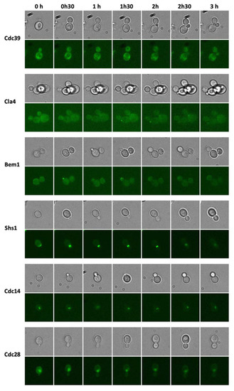 To evaluate the suitability of the developed yeast chips to perform dynamic analyses of protein expression and protein localization in single yeast cells, a small set of 6 clones were selected, i.e. Cdc39, Cla4, Bem1, Shs1, Cdc14 and Cdc28. A time-lapse experiment was performed where these clones were observed at higher resolution (600× magnification) during 3 h (Figure 7).