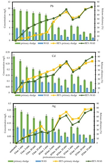 The presence of heavy metals in sludge is an environmental challenge, and it has a negative effects on the anaerobic digestion process []. Steam explosion pretreatment was used as a new technique for heavy metal release in the primary sludge and WAS. The effects of pressure and retention time on the behavior of heavy metals such as Pb, Cd, and Ag in primary sludge and WAS were examined, and the results are shown in Figure 1.