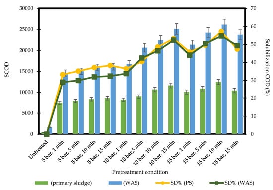 According to Table 1, the increased pressure and retention time led to improved solubility of COD (Figure 3). The greatest increase in SCOD was obtained at 10 bar for 15 min, 15 bar for 10 min, and 15 bar for 5 min for WAS and primary sludge. The SCOD of primary sludge in these pretreatments was optimized by 53%, 57%, and 49%, respectively. The SCOD of waste activated sludge was improved by 52%, 54%, and 50%, respectively. Therefore, increasing the pressure and the retention time increased the SCOD amount because more organic material was digested in the primary sludge and WAS and more soluble components entered the liquid phase (Figure 3).