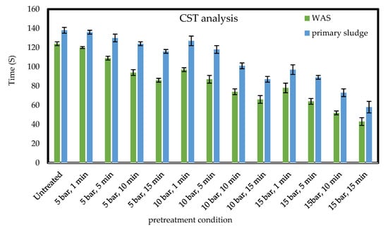 CST analysis was used to reveal the effects of steam explosion pretreatment on the filterability and dewaterability of primary sludge and WAS. The CST values of primary sludge and WAS were 124 s and 138 s, respectively (Figure 4).