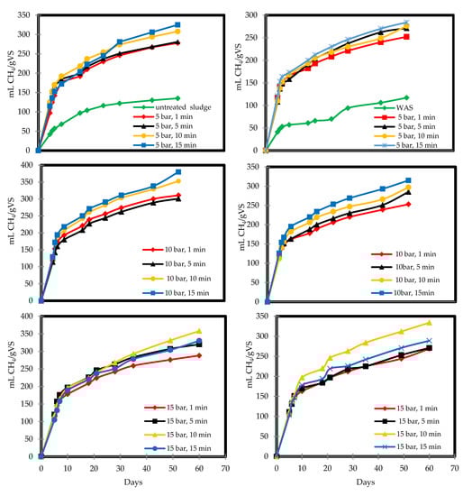 The methane production of the WAS and primary sludge without pretreatment or control samples after 60 days was 117 and 135 mL CH4/g VS, respectively (Figure 5). Theoretical methane yield based on Equation (1) was estimated at 470 mL CH4/g VS. Total methane production of the PS and WAS pretreated with all of the steam explosion treatments were higher than those of the primary sludge and WAS without pretreatment. After pretreatment, the best methane yield was obtained after pretreatment with 10 bar for 15 min and 15 bar for 10 min, with respective values of 380 and 358 mL CH4/g VS for the primary sludge and 315 and 334 mL CH4/g VS for the WAS (Table 2, Figure 5). Accordingly, the methane yields of primary sludge and WAS increased by 181% and 185%. The highest initial production rate was obtained after pretreatment of sludge at 10 bar for 10 min and 10 bar for 15 min, resulting in 218 and 207 mL CH4/g VS, a 220% increase versus the values in untreated primary sludge of 68 mL CH4/g VS. For the WAS, the highest initial production rate was observed at 15 bar for 10 min and 10 bar for 15 min, with increases of 245% to 197 and 192 mL CH4/g VS, respectively (Table 2, Figure 5).