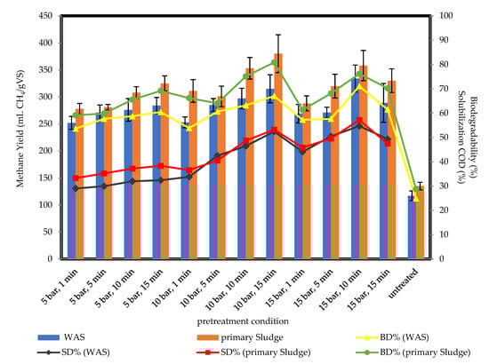 The steam explosion pretreatment led to enhanced solubilization followed by biodegradability when high pressures (10 and 15 bar) with long retention times were applied (Figure 6). The best solubilization was observed at 10 bar for 15 min and 15 bar for 10 min pretreatment, with improvements of 57% and 54% for primary sludge and WAS, respectively. However, the 15 bar for 15 min pretreatment resulted in decreasing the solubilization and biodegradability. This decrease was due to the thermal reaction that led to the change in chemical structure and the complete destruction of the biodegradable matter []. Additionally, when the retention time was too short (i.e., 1 and 5 min) at all pressures, the pretreatment was not successful in structure breakdown or in changing the chemical structure. The conditions with the pressure and time of greater 5 bar and 5 min, respectively, had the greatest effect on the methane yield of the PS and WAS []. The biodegradability of pretreated primary sludge and pretreated WAS was found to increase from 29% and 25% to 80% and 71%, respectively (pretreatment at 10 bar for 15 min for sludge and 15 bar for 10 min for inoculum) (Figure 6). These results indicated the steam explosion hydrolyzes the solids or disrupts their structure; thus, COD organic matter became available to microorganisms and, consequently, the biodegradability was improved.