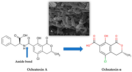Proposed cleavage of ochratoxin A by Cupriavidus basilensis ŐR16. The amide bond hydrolysis forming ochratoxin α as the major degradation product [19]. A— Scanning electron microscope (SEM) micrograph, magnification of 40,000 of a Cupriavidus basilensis biofilm [30].