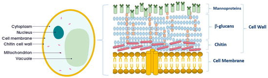 Constitution of yeast and yeast cell wall. Yeast β-glucans form long chains of a β-(1→3) linked glucan backbone with β-(1→6) linked glucose side branches Adapted from Anwar et al. [40].