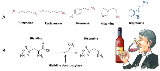 Biogenic amines (BAs) are low-molecular-weight organic molecules originating in fermented foods from the microbial catabolism of the corresponding amino acids. Wine BA includes putrescine (from arginine and ornithine), cadaverine (from lysine), tyramine (from tyrosine), histamine (from histidine), and tryptamine (from tryptophane) [9]; Figure 3. The production of BAs is a strategy to obtain metabolic advantages to face certain stress conditions [58].