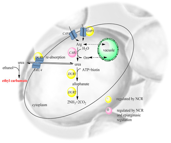 To better understand the metabolic formation of EC in S. cerevisiae, transport and metabolic regulation of urea in S. cerevisiae must be studied. Intracellular urea mainly results from the degradation of arginine through catalysis by arginase (Figure 4). As a toxic and poor nitrogen source for S. cerevisiae, the generated urea is usually accumulated and exported to the nearby medium via a facilitated transport diffusion system (Figure 4, [74]). S. cerevisiae metabolizes urea in two steps. First, urea is carboxylated to form allophanate by urea carboxylase. Then, allophanate is degraded to CO2 and NH4+ by allophanate hydrolase. The activities of urea carboxylase and allophanate hydrolase are performed by a bifunctional enzyme, urea amidolyase, encoded by the DUR1,2 genes, and silenced by nitrogen catabolic repression (NCR) [80]. The DUR3 gene encodes urea permease. Under fermentation conditions, degradation is obstructed by arginine, which is abundant in fermented sources and acts as a superior nitrogen supply compared with urea [74].