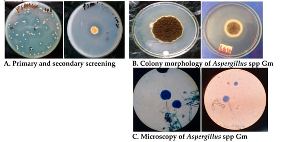 (A)Primary and secondary screening for Aspergillus spp. Gm.(B)Colony morphology of Aspergillus spp. Gm. (C) Lactophenol cotton staining of Aspergillus spp. Gm.