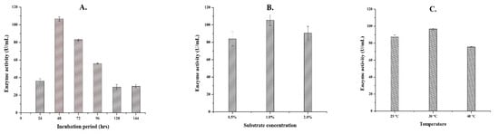 Optimization of the fermentation conditions for maximum enzyme production from strain Aspergillus spp. Gm. (A), effect of incubation period; (B), effect of substrate concentration; and (C), effect of temperature on enzyme production.