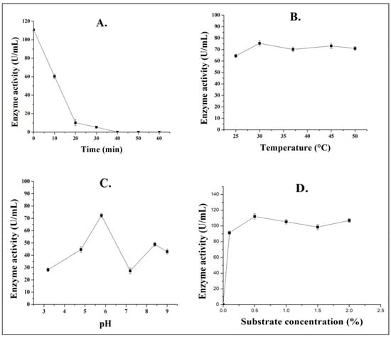 Acidic pectinase is useful in preparation of plant protoplast, to perform partial saccharification of sugars, to study phytopathogens invasion in plant, and in other various plant biotechnology applications []. However, the activity of pectinase enzyme was observed highest (112.0 U/mL) at 0.5% of substrate concentration. Numerically, the activity of pectinase varies with various substrate concentration (Figure 3D). However, statistically, there was no significant difference in the activity of enzyme with various substrate concentration (p < 0.05). Studies have reported that low substrate concentrations are useful to achieve higher enzyme activity [,]. High substrate (pectin) concentrations decrease the availability of enzymes and lower the amount of free water in the system. Free water availability is an important factor for maximum enzymatic activity []. Therefore, low substrate concentration (0.5%), as observed in this study, could be useful to achieve highest activity of pectinase enzyme.