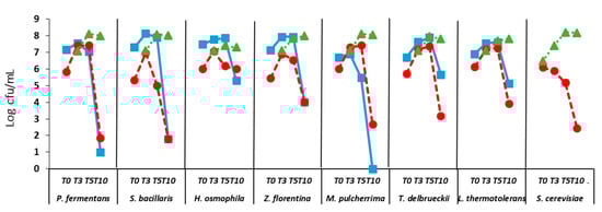 | P. fermentans | S. bacillaris | H. osmophila | Z. florentina | M. pulcherrima | T. delbrueckii | L. thermotolerans | S. cerevisiae | |