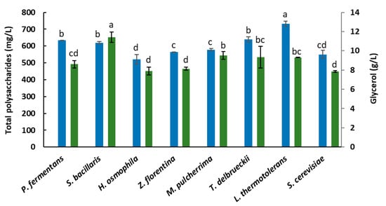 | T. delbrueckii | 3.32 ± 0.00 b | 12.70 ± 0.15 c | 0.30 ± 0.03 bc | 6.07 ± 0.02 a | 1.13 ± 0.02 bc | 0.17 ± 0.02 bcd | 14 ± 0.50 bc | 1350 ± 42.50 ab | 181 ± 11.50 abc |