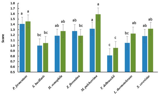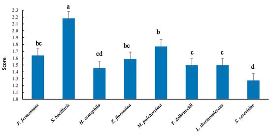 | S. bacillaris | 3.34 ± 0.02 ab | 12.85 ± 0.00 bc | 0.37 ± 0.02 b | 5.80 ± 0.06 ab | 1.06 ± 0.02 bc | 0.11 ± 0.00 d | 13 ± 2.50 c | 1556 ± 30.50 a | 204 ± 0.50 a |