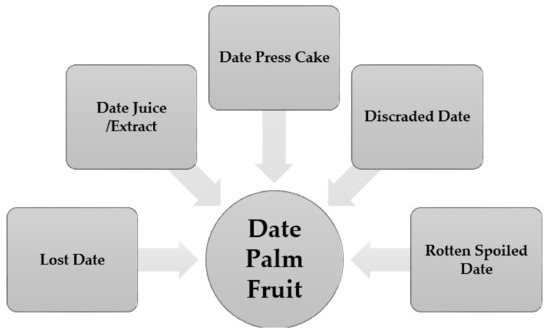 - Chandrasekaran, M.; Bahkali, A.H. Valorization of date palm (Phoenix dactylifera) fruit processing by-products and wastes using bioprocess technology—Review. Saudi J. Biol. Sci. 2013, 20, 105–120. [Google Scholar] [CrossRef] [PubMed]