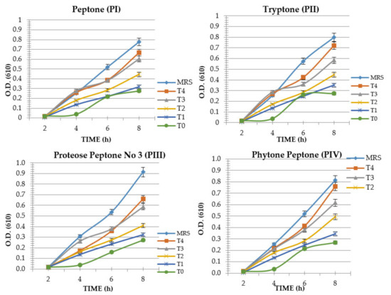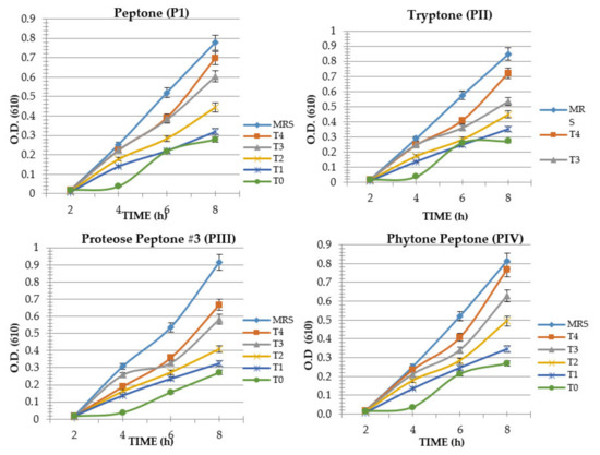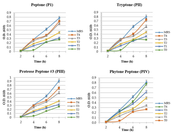 Growth of L. reuteri 55730 during incubation at 37 °C for 8 h in MRS and DPM as measured by the optical density at 610 nm. T0 = control, T1 = 0.2%, T2 = 0.4%, T3 = 0.6%, T4 = 0.8% of protein source; PIV = Phytone Peptone, PIII = Proteose peptone No. 3, PII = Tryptone, PI= Peptone.
