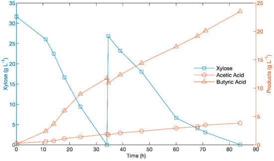 - Jiang, L.; Wang, J.; Liang, S.; Wang, X.; Cen, P.; Xu, Z. Production of Butyric Acid from Glucose and Xylose with Immobilized Cells of Clostridium tyrobutyricum in a Fibrous-Bed Bioreactor. Appl. Biochem. Biotechnol. 2010, 160, 350–359. [Google Scholar] [CrossRef]