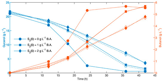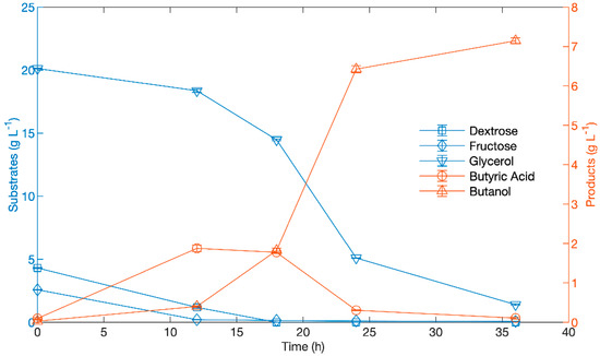 Work has been done to utilize the metabolism of C. pasteurianum when grown in a dual-substrate fermentation on sugars and glycerol [9,13,15,16]. The initial consumption of the sugars allows production of butyric acid, which can be beneficial to production of butanol from glycerol. Kao et al. used high concentrations of both glucose and glycerol (20 and 60 g/L, respectively) to achieve a molar yield of 0.38 mol butanol/mol glycerol, though this calculation does not include the glucose consumed [15]. Sabra et al. used another glucose and glycerol dual fermentation (50 g/L of each) to produce a high concentration of butanol of 21 g/L, and while the final concentration of butanol is high, the overall molar yield from both substrates remains low [9]. While both of these fermentation strategies were successful in producing high amounts of butanol, the amount of substrate required would prevent the process from becoming economically viable.