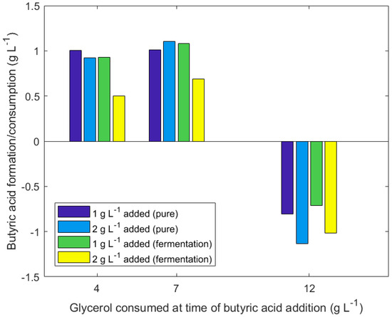 Comparison of the amount of butyric acid produced or consumed when added during fermentation with differing amounts of remaining glycerol.