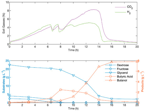 Following validation of the model, fermentation at the reactor scale was conducted to allowing analysis of the gaseous products and greater process control, primarily control of the pH. The effects of pH on C. pasteurianum fermentations using glycerol as the carbon source have been shown to alter the product profile observed [8]. The pH was held at 5.3, as that would allow 25% of the butyric acid to be fully protonated and thus facilitate assimilation by the cells [12].