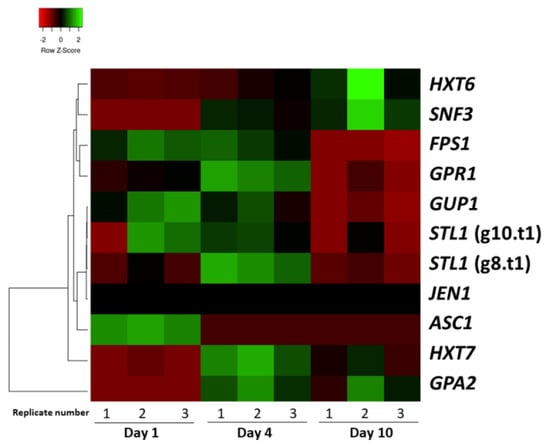 | Sugar transport and sensors | HXT (x17); SNF3; RGT2; FPS1; GPR1; GUP1; GUP2; STL1; JEN1; ASC1; ASC2; GPA2 | HXT (x2); SNF3; GPR1; GUP1; STL1 (x2); JEN1; ASC1; GPA2 |
