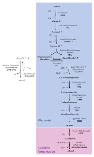 | Glycolysis | HXK1; HXK2; PGI1; PFK1; PFK2; FPBA1; TPI1; TDH1; TDH2; TDH3; PGK1; GPM1; ENO1; ENO2; CDC19; PYK2 | HXK2; PGI1; PFK1; PFK2; FPBA1; TPI1; TDH2; TDH3; PGK1; GPM1; ENO1; ENO2; CDC19 |