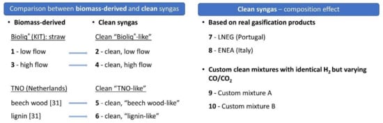 Schematic representation of the experiments performed. Each biomass-derived syngas was compared to clean syngas containing the same composition, but without the impurities (set-ups 1 to 6). The arrows denote pairs of fermentations that were compared side-by-side. Fermentations performed with biomass-derived syngas from TNO Energy Transition, Biomass and Energy Efficiency Unit, the Netherlands, were described elsewhere [31]. Different clean syngases were also tested individually (set-ups 7 to 10), in order to assess the effect of the clean syngas composition on the fermentation outcome. All clean syngases were commercially-mixed, containing only CO, CO2, H2 and N2. In the case of set-ups 7 and 8, it additionally contained CH4.
