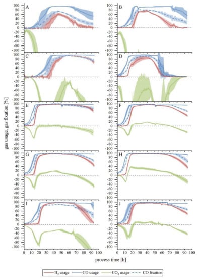 The simultaneous consumption of H2 and CO started, in all cases, after the CO consumption had increased, but in some cases, before it reached complete consumption. Due to the increasing biomass concentration, the amount of dissolved CO in the medium decreases, enabling H2 uptake [38,39]. This can also explain why growth and H2 usage were linked in all cases: when growth stopped, so did H2 usage. As fewer cells are metabolically active, there is less competence for CO, and each remaining active cell is exposed to a higher CO concentration, leading to a decline in H2 consumption. This observation agrees with what has been reported by Valgepea et al. [40], and it could be confirmed that it is valid for both, clean, and biomass-derived syngas, as long as no hydrogenase-inhibiting compound is present.