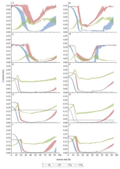 Off-gas profile for set-ups 1 to 10. (A) to (J), in alphabetical order, refer to each individual set-up, in numerical ascending order—(A) is set-up 1, (B) is set-up 2, etc. The molar flow rate is shown here, as obtained from the measurements of the on-line GC, for H2 (red line), CO2 (green line) and CO (blue line). Lines show the average of a triplicate (n = 3), while the lighter colored areas depict the standard deviation.