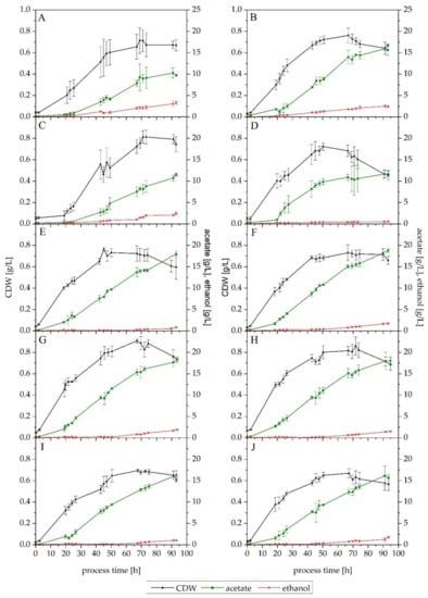 Growth and product formation of set-ups 1 to 10. (A) to (J), in alphabetical order, refer to each individual set-up, in numerical ascending order—(A) is set-up 1, (B) is set-up 2, etc. Average values of the triplicates (n = 3) for cell dry weight (CDW, black triangles), acetate (green squares) and ethanol (red dots), with standard deviation. Points indicate actual measurements. Lines are only depicted for clarity purposes.