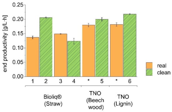 End-point productivity for pairs of real and clean syngases. Numbers 1 to 6 indicate the set-up, while stars (*) refer to TNO real gases (data published elsewhere, [31]). The productivity, as measured at the end of the fermentation, is shown by the bars. Real, biomass-derived syngases are represented by smooth orange bars, while clean, commercially-mixed syngases are shown by diagonally striped green bars. All values are given as the average of a triplicate, with standard deviation.