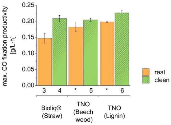Productivity up to the end of maximum CO fixation for pairs of real and clean syngases. Numbers 3 to 6 indicate the set-up, while stars (*) refer to TNO real gases (data published elsewhere, [31]). The productivity, as measured at the end of the fermentation, is shown by the bars. Real, biomass-derived syngases are represented by smooth orange bars, while clean, commercially-mixed syngases are shown by diagonally striped green bars. All values are given as the average of a triplicate, with standard deviation. No values are given for set-ups 1 and 2 due to the fact that no maximum CO fixation occurred.