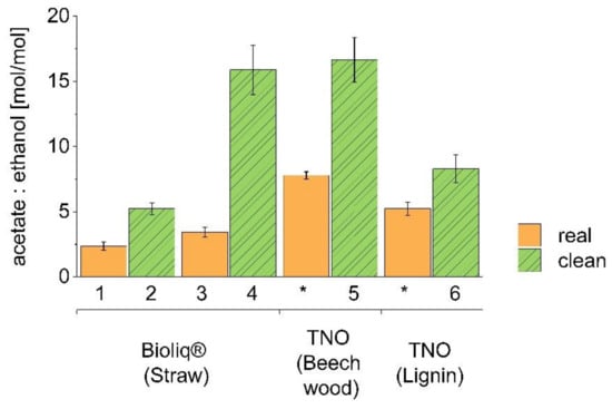 Molar acetate to ethanol ratio for pairs of real and clean syngases. Numbers 1 to 6 indicate the set-up, while stars (*) refer to TNO real gases (data published elsewhere, [31]). The ratio of acetate to ethanol, in mol, as measured at the end of the fermentation, is shown by the bars. Real, biomass-derived syngases are represented by smooth orange bars, while clean, commercially-mixed syngases are shown by diagonally striped green bars. All values are given as the average of a triplicate, with standard deviation.