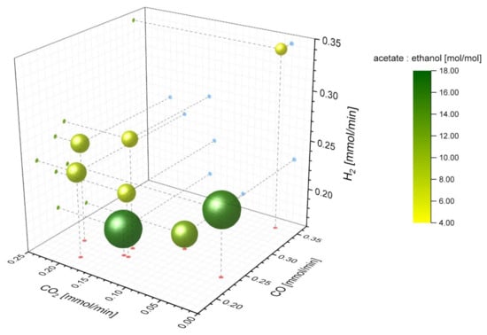 Molar acetate to ethanol ratio obtained from each combination of tested CO, CO2, and H2 molar substrate flow rate for clean syngases. The acetate to ethanol molar ratio for set-ups 2, 4, and 5 to 10 is shown according to the molar flow rate of each substance fed into the bioreactor. The size and color of each bubble is proportional to the molar acetate to ethanol ratio. Smaller size and yellow color denote a lower acetate to ethanol ratio. Bigger bubbles and green color, indicates a higher acetate to ethanol ratio. H2 is represented on the Z axis, CO2 on the Y axis and CO on the X axis. Blue dots represent the YZ projection, red dots the XY projection, and green dots, the ZX projection. Drop lines (dotted grey lines) are visual aids to assigning each bubble its value in each axis.