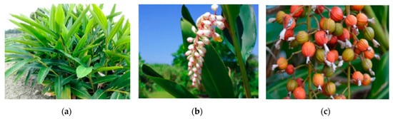 Photos of Alpinia zerumbet plant (a), flower (b) and fruits (c). Adapted from [].