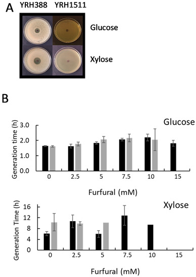 Inhibition by furfural. Comparison of inhibition of parental strain S. cerevisiae YRH388 and zwf1-mutant YRH1511. (A). A filter disk saturated with liquid furfural (8 µL) was placed in the center of a lawn of plated cells on YP medium containing 2% w/v glucose or xylose. Representatives of triplicate plates are shown. A small zone of inhibition was observed for YRH388, compared to nearly complete inhibition of YRH1511 after incubation for 96 h. Glucose plates were inoculated with 106 cfus; xylose plates were inoculated with 107 cfus. (B). Doubling times of YRH388 (black) and YRH1511 (gray) on YP medium containing glucose (top) or xylose (bottom) and furfural at varying concentrations. YRH1511, growing on glucose, did not grow when more than 10 mM furfural was present. In medium containing xylose, YRH1511 did not grow when greater than 5 mM furfural was present. Error bars show standard deviation of four replicates.