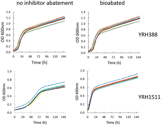 Microwell growth assays of YRH388 and PPP mutant YRH1511 in unabated and bioabated corn stover dilute-acid hydrolysate. Panels show seven or eight replicates (shown as individual lines of various colors) for the indicated strain and hydrolysate. Sugar concentrations are stated in Table 3.
