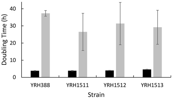 Yeast growth was measured in microwell assays using a Bioscreen C Automated Growth Curve Analysis System (Growth Curves USA, Piscataway, NJ, USA). Unless otherwise stated, growth curves were carried out at least in quadruplicate as follows. Individual colonies were each inoculated into 1.0 mL of mineral medium and mixed by vortexing. Then, 10 µL was transferred to 290 µL of the experimental medium in 400 µL capacity sterile honeycomb wells in a 100-well plate. Hydrolysates were diluted to one-half strength to allow optical density measurements and were supplemented with 2 g/L yeast extract and 4 g/L peptone, in order to facilitate growth. Perimeter wells of the plate contained water to minimize evaporation during incubation. Plates were incubated at 30 °C with intermittent shaking. Optical density (420–580 nm Wideband setting) was recorded at 30 min. intervals via the manufacturer’s EZExperiment software and exported to a spreadsheet (Microsoft Excel, Redmond, WA, USA) for analysis. Optical density was converted to OD (600 nm) using the equation OD600 equivalent = 0.6748X4 − 0.749X3 + 0.5352X2 + 1.0739X (r2 = 0.9989, where X is the background-substracted wideband OD).