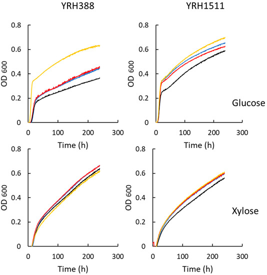 Growth of YRH388 and PPP mutant YRH1511 in recycled corn stover dilute-acid hydrolysate supplemented with glucose (top) or xylose (bottom). Due to carryover of unconsumed xylose in recycled hydrolysate, the hydrolysate shown in the top panels contained 0.20% (w/v) xylose along with 0.14% (w/v) added glucose. The bottom panels had no residual glucose and 0.52% added xylose. Each panel shows four replicates (shown as individual lines of various colors) for the indicated strain and hydrolysate in microwell growth assays.