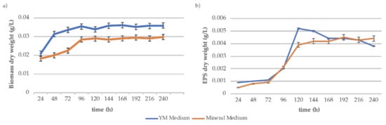 YM and mineral Medium were compared in terms of biomass and EPS production on submerged fermentation. As shown in Figure 1, biomass (a) and EPS (b) production is similar in both YM and mineral media. After 240 h of cultivation, biomass concentration was 0.0360 g/L in YM medium while a 0.0298 g/L biomass concentration was obtained from mineral medium. Moreover, it is important to note that EPS production is very low at the first 72 h of cultivation, resulting in a higher production after 120 h of culture in both media, being the highest EPS concentration obtained from YM medium (0.0052 g/L). Both biomass and EPS maximum concentration from both media resulted not significantly different and proved to be fairly constant after 168 h of culture.