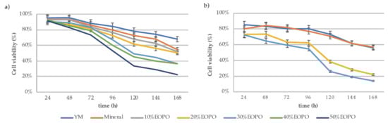 Culture viability in presence of EOPO was evaluated by cell count in a Neubauer chamber and Methylene Blue coloration. Concentrations from 10% to 50% (v/v) were tested for EOPO 970, while 20% and 30% (v/v) were tested for EOPO 12,000. As shown in Figure 2, cultures in presence of EOPO 12,000 (a) or EOPO 970 (b) showed an important decrease in viability after 96 h. More importantly, culture viability decreased by 35% after 168 h in comparison to YM and mineral media controls. Higher EOPO concentrations in both experiments signified higher drops in culture viability, where concentrations higher than 30% EOPO signified less than 50% cell viability after 96 h of culture.