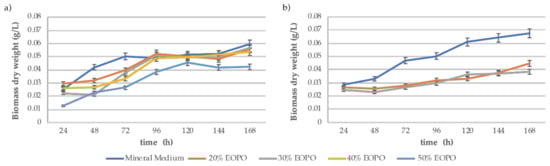 Biomass production in submerged fermentation of Rhodotorula mucilaginosa UANL-001L cultures in presence of (a) EOPO 970 or (b) EOPO 12,000. Cultures were maintained in liquid medium on sterile conditions and kept in incubation for 3 days at 30 °C and 250 rpm.
